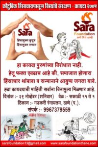 कौटुंबिक हिंसाचारापासून स्त्रियांचे संरक्षण अधिनियम म्हणून २००५ साली हा कायदा सर्वसंमत झाला. हा कायदा पुरुषांच्या विरोधात नाही पण हा कायदा काय आहे, कळावे व त्याचा प्रचार आणि प्रसार व्हावा म्हणून सारा फौंडेशन ह्या सामाजिक संस्थेने २९ नोव्हेंबर २०१४ रोजी सकाळी ११ ते २ ह्या वेळेत गडकरी रंगायतन ठाणे येथे हा कार्यक्रम विनामुल्य ठेवलेला होता.
